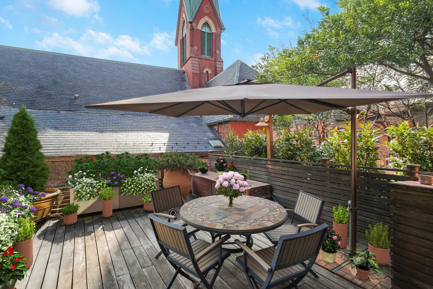 The enormous second-story terrace was designed with built-in cabinets, high terra cotta planters, amphora and multi-flowered landscape. It resembles a Sicilian tree-house facing the sloping slate roof of an Italianate cathedral and surrounded by mature trees.