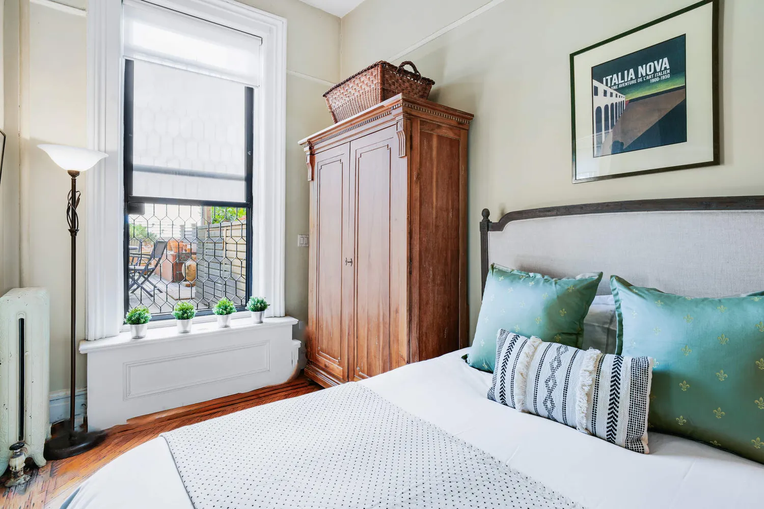 The peaceful bedroom has a built-in window seat. Wake up looking at the sunny lush outdoors and gorgeous church views. Built-in 2-level bookshelves and a TV & dresser alcove were outfitted facing the bed .