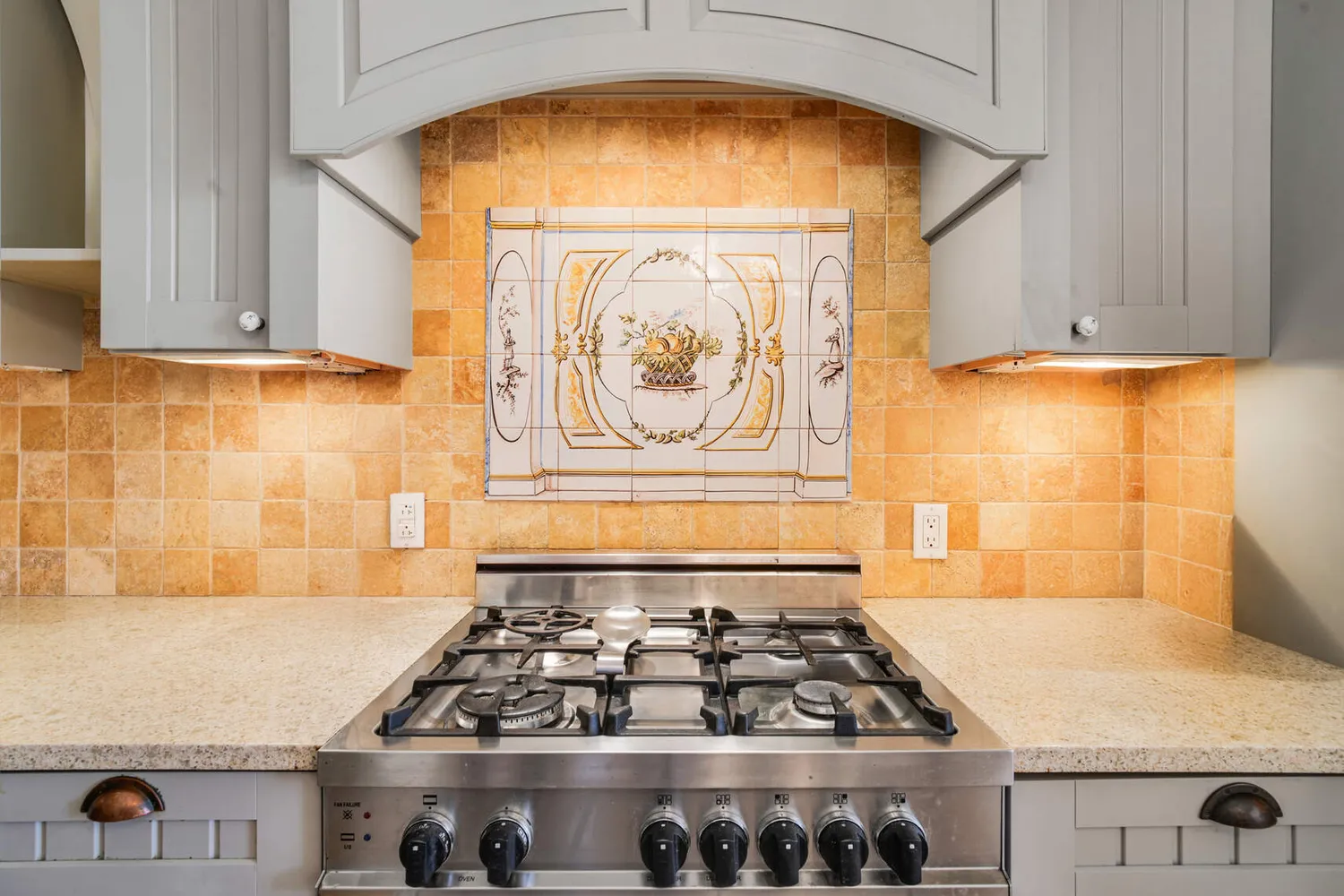- A hand-assembled antique-inspired Spanish tile mural, underneath a French hooded