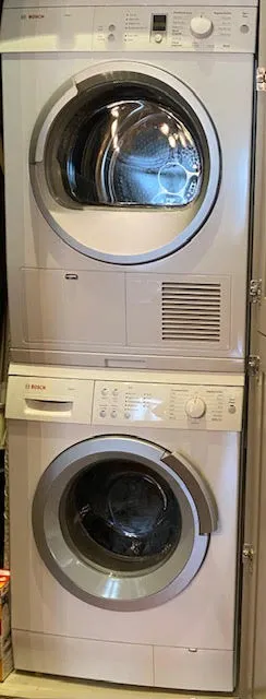 - An enclosed two-tier Bosch washer and dryer.