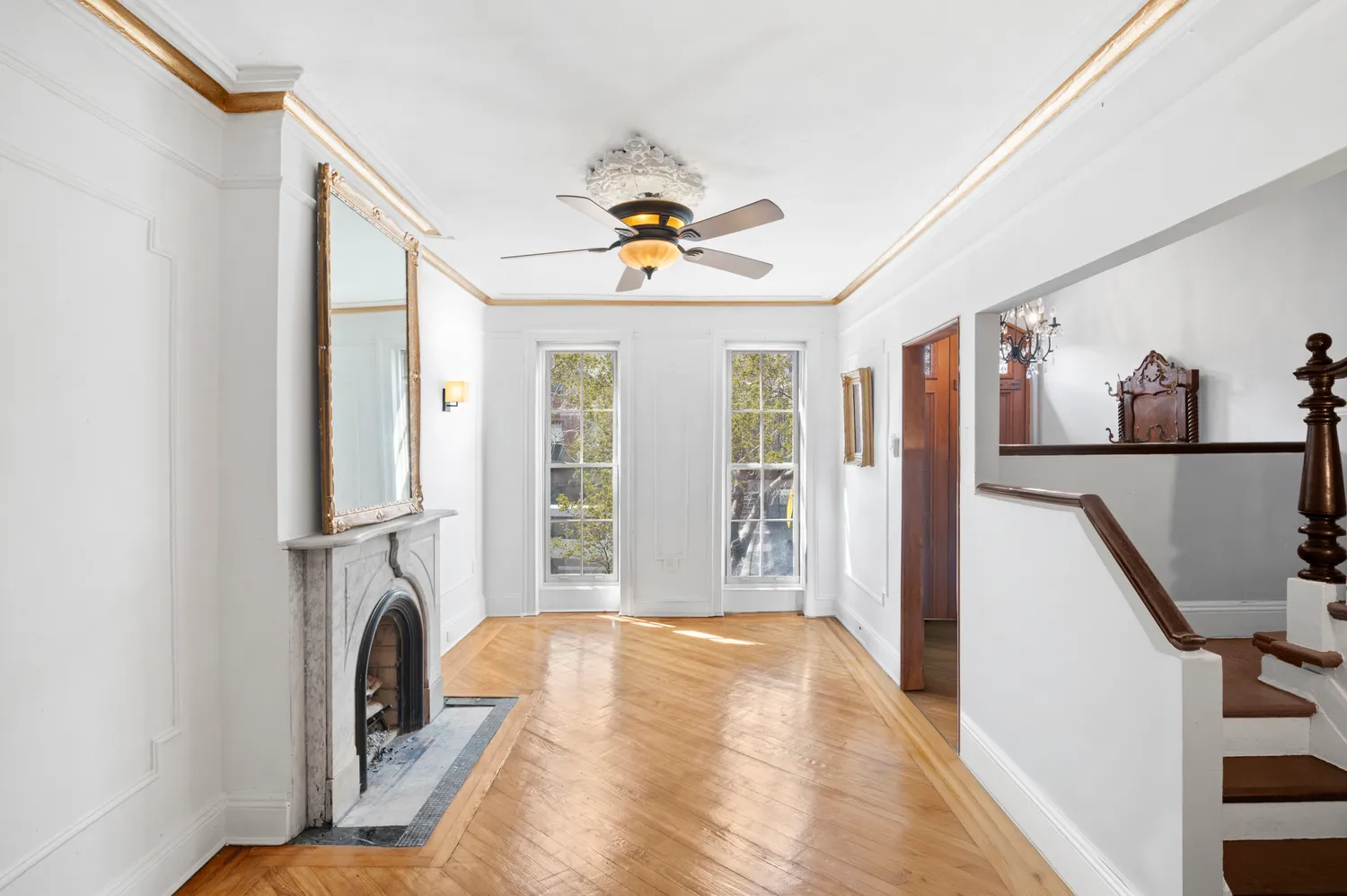 As you enter the parlor floor through the formal foyer, you are greeted by beautiful original wood floors, tall ceilings with intricate moldings, and an expansive living room with a stunning original marble wood-burning fireplace. The large living room has ample space for multiple seating arrangements, and two large south-facing windows bring in natural light all day long. The dining room features a pantry with an additional storage closet and easily accommodates a dining table with extra furniture. A beautiful glass door leads to the lovely back deck. The windowed, white kitchen boasts a gas range and stainless steel dishwasher with a pass-through window to the dining room. A renovated half bath with a washer and dryer completes the parlor level.