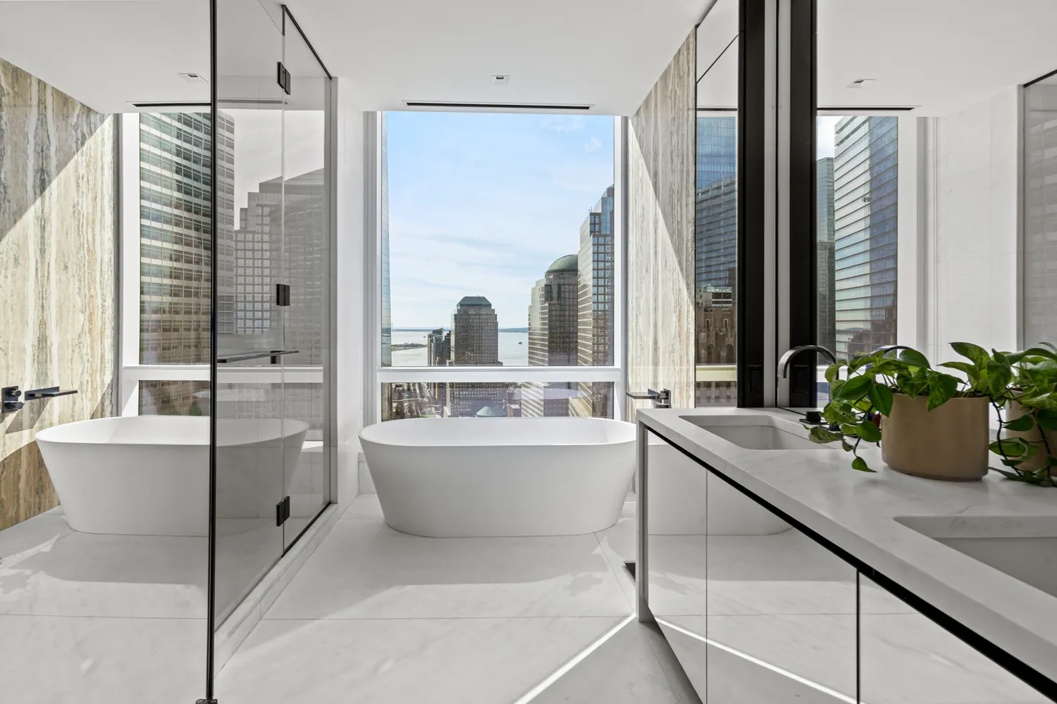 The second bedroom provides stunning east-facing views, an en-suite marble bath, and a custom closet. For added convenience, the apartment includes a washer and vented dryer, and all rooms are equipped with motorized window shades.