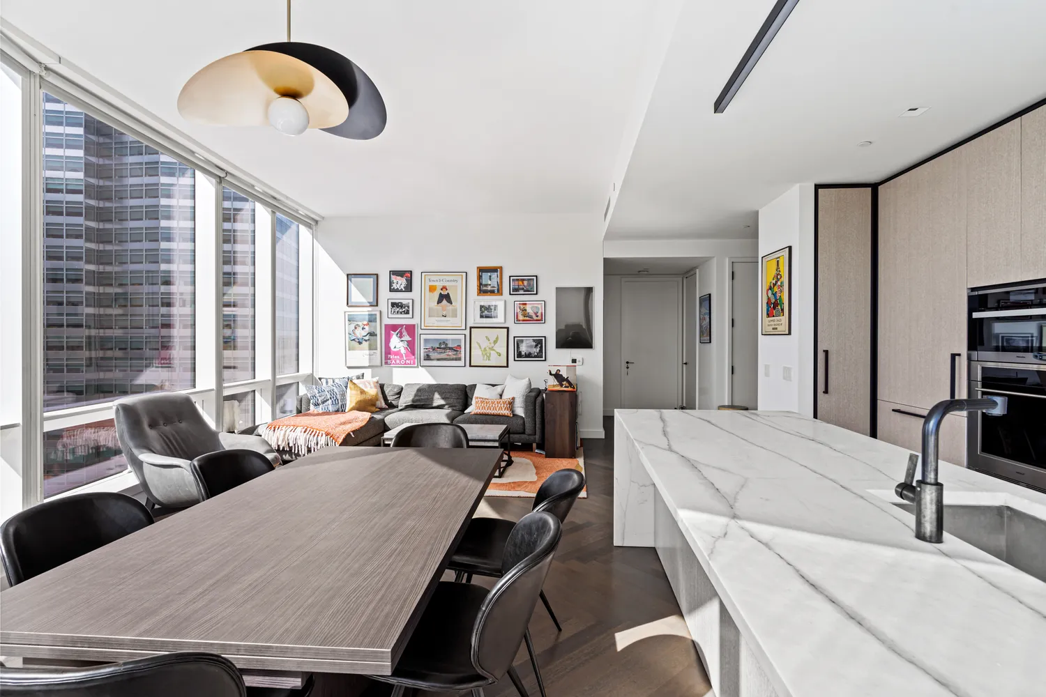 Upon entering, you'll be greeted by a formal gallery that leads to a sun-drenched living room and an open-concept kitchen. The space is adorned with floor-to-ceiling, elegantly curved glass windows, allowing for an abundance of natural light and unparalleled views.