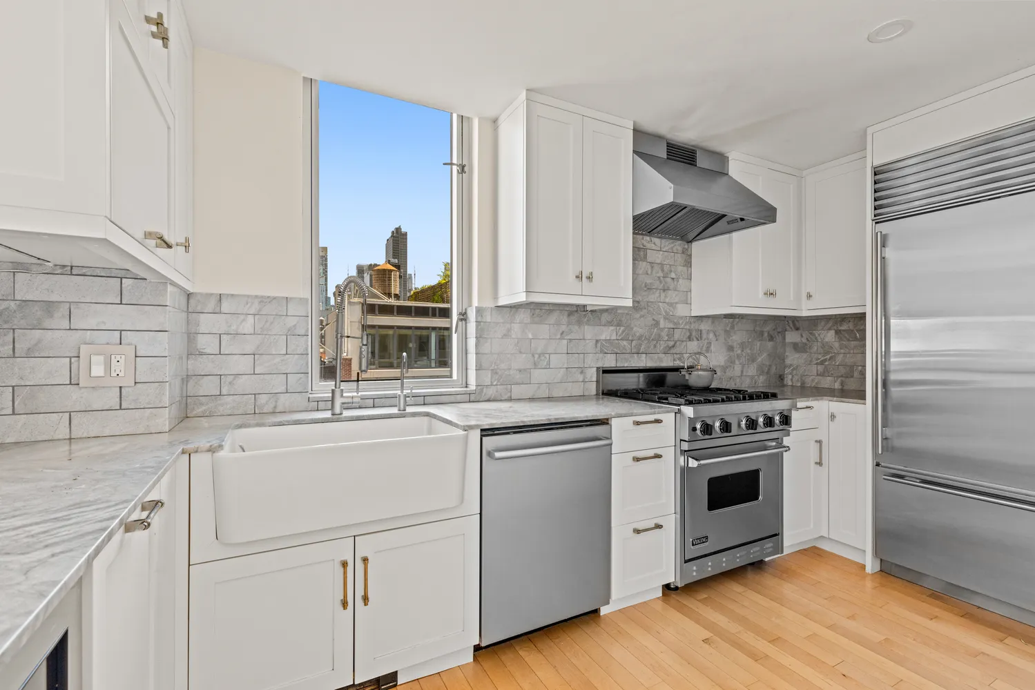 A private keyed elevator opens directly into a north-facing living and dining area with soaring ceilings, a wood-burning fireplace, and a balcony offering iconic views of the Empire State Building and city skyline. The open chef’s kitchen is newly renovated and outfitted with a Viking range, Sub-Zero refrigerator and wine cooler, and a Bosch dishwasher—perfect for entertaining or everyday living.