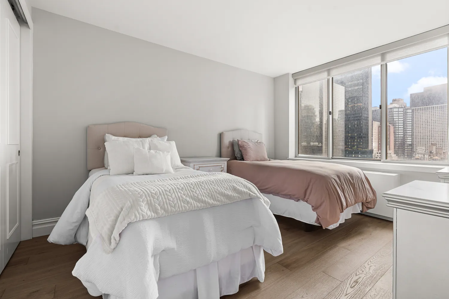 Step into this newly renovated, oversized corner one-bedroom that seamlessly blends modern elegance with contemporary comfort and abundant closet space. Featuring rich oak hardwood floors, custom blinds, high-end finishes, and a sleek, modern bathroom, every detail is thoughtfully designed. The windowed kitchen offers generous counter space and premium (LG) stainless steel appliances, including a French door refrigerator, five-burner gas stove with griddle, full-size dishwasher, and microwave/convection oven. The expansive living and dining area is flooded with natural light from oversized south and east-facing windows, offering sweeping city views and spectacular sunrises.