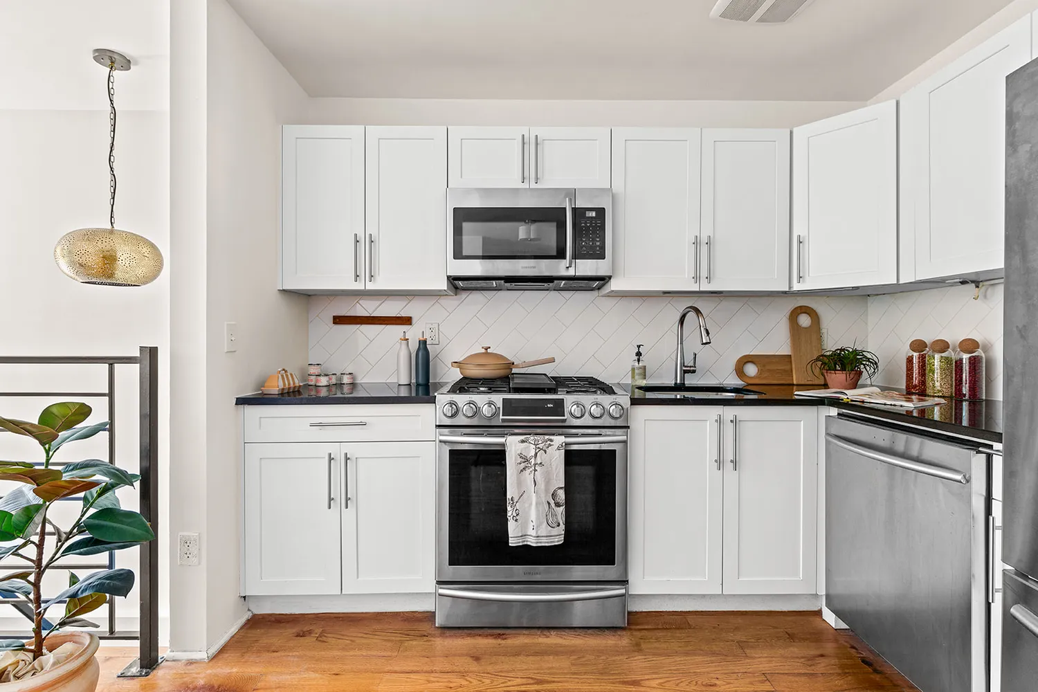 Upstairs, the airy, open-plan living and dining area flows seamlessly to a bright kitchen with full-size stainless steel appliances and a herringbone tile backsplash. Oversized windows frame views of the beautifully landscaped private garden, thoughtfully designed with lush perennials and professionally installed, dog-friendly astroturf—making it effortless for the next owner to enjoy. An open stairwell to the lower level adds light and dimension to the space. The king-size bedroom offers quiet retreat, and the full bath features a deep soaking tub with a rain shower and warm natural textures.