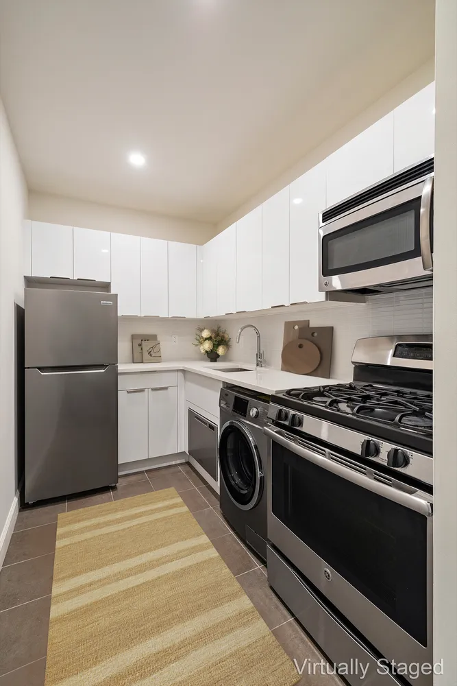 The renovated kitchen features minimalist glossy white cabinetry with white tile backsplash and stainless steel, full sized appliances including dishwasher, and...Welcome to 194 East 2nd Street, a brand new full service rental experience in the heart of the East Village.