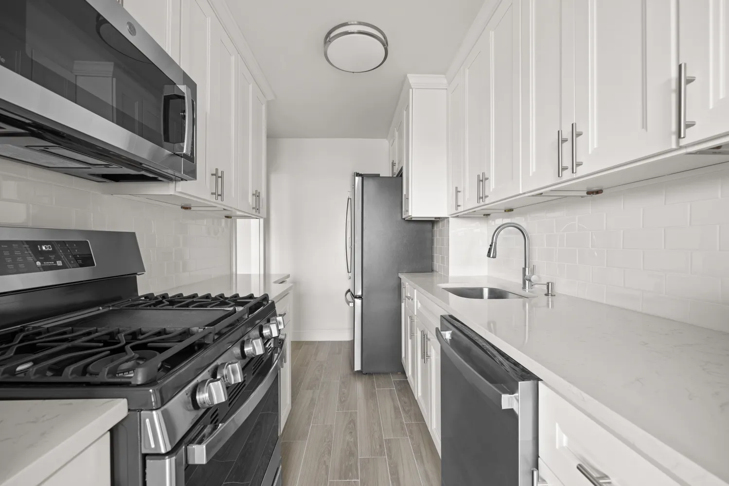Cook to your hearts contents in the brand new kitchen, complete with plentiful mission style cabinetry, ample quartz counters and GE Profile Stainless Steel appliances including a french door fridge, microwave, stove and dishwasher leading into the sun-filled dining area.