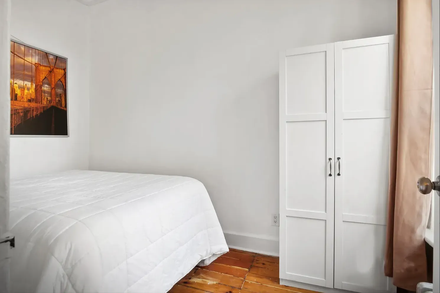 The separate kitchen includes a cozy eat-in café-style counter, perfect for casual dining or morning coffee. The spacious bedroom accommodates a...Welcome to this serene and charming one-bedroom apartment in a historic brownstone on a quiet, tree-lined block in Fort Greene/Clinton Hill. This inviting home overlooks a lush garden, offering a peaceful retreat from city life. Bathed in morning light, the apartment features beautiful exposed brick walls and warm wood floors that add character and charm.