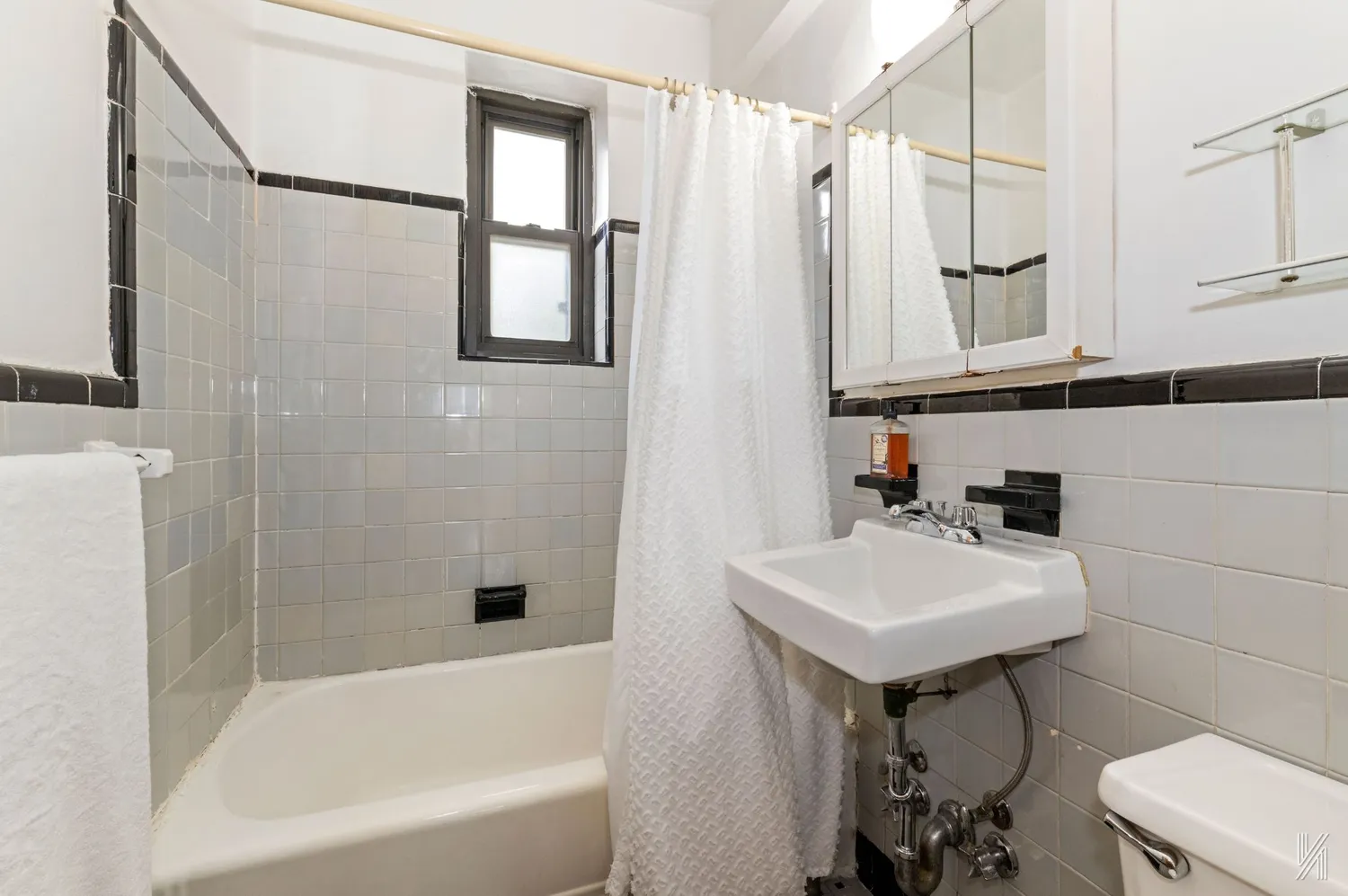 In the bedroom, the oversized window, complete with screens, floods the room with light. It is spacious enough to easily fit a queen-sized bed and a large bureau. The windowed bathroom showcases grey tile with black trim and includes a shower/tub combo. There is also a large mirrored medicine cabinet and additional glass shelves for storage.