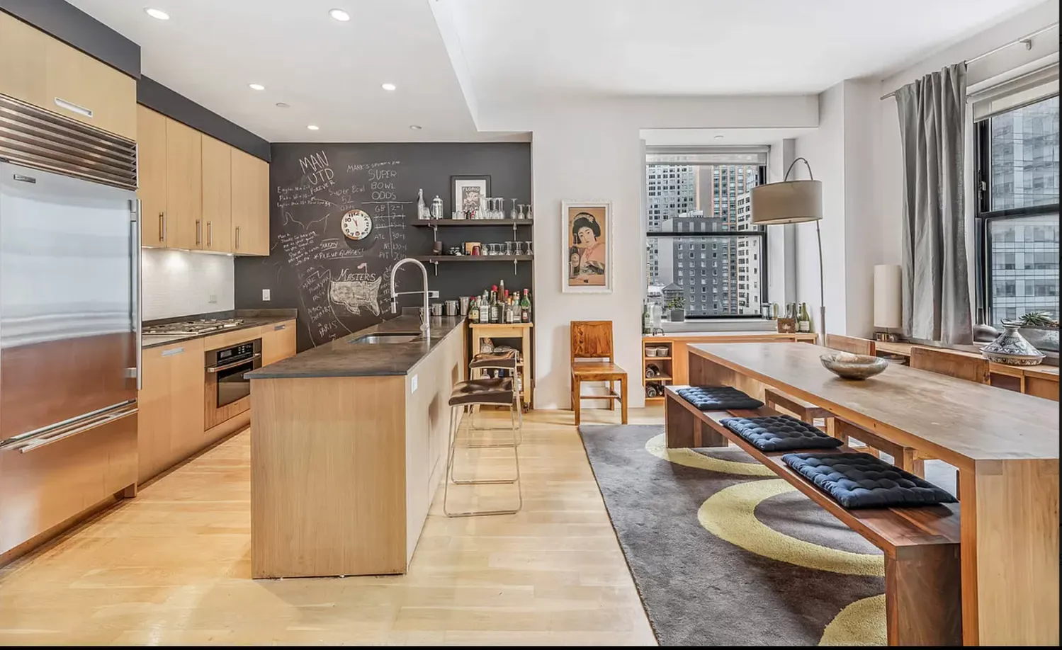 In addition to the 10’ ceilings, white oak wide plank flooring, abundant closets, original exposed industrial metal beams, and an in unit washer/dryer, there is an incredible open chef’s kitchen with a 9ft island, bamboo cabinetry and top of the line Subzero & Bosch appliances.