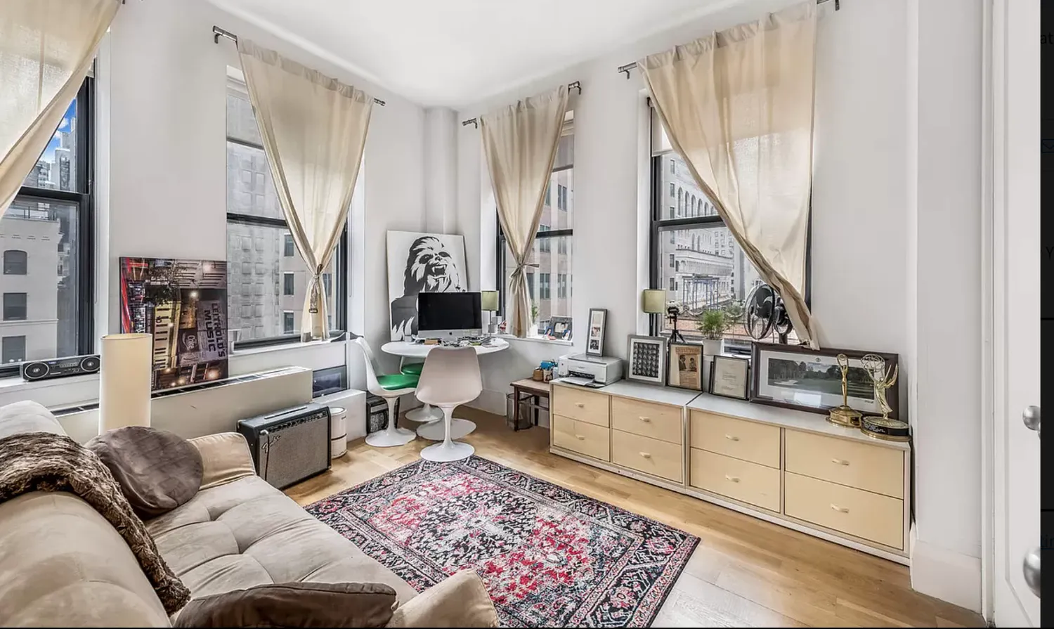 This bright and airy corner 1,317 SF apartment boasts 11 oversized windows which face north, south and east. The apartment features incredible views of several landmark buildings including The New York Stock Exchange and The Federal Reserve.