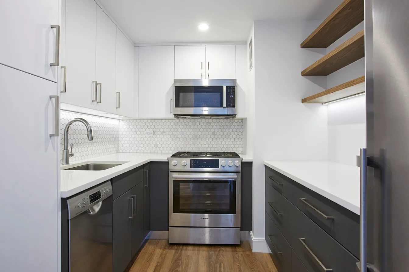 In the kitchen, you’ll find all new Bosch stainless appliances, white stone countertops over charcoal cabinetry: the backsplash has a fun, honeycomb pattern. Three open shelves in a dark wood add visual appeal, and a tall pantry with multiple shelves allows you to stock up on all your essential cooking and baking supplies.