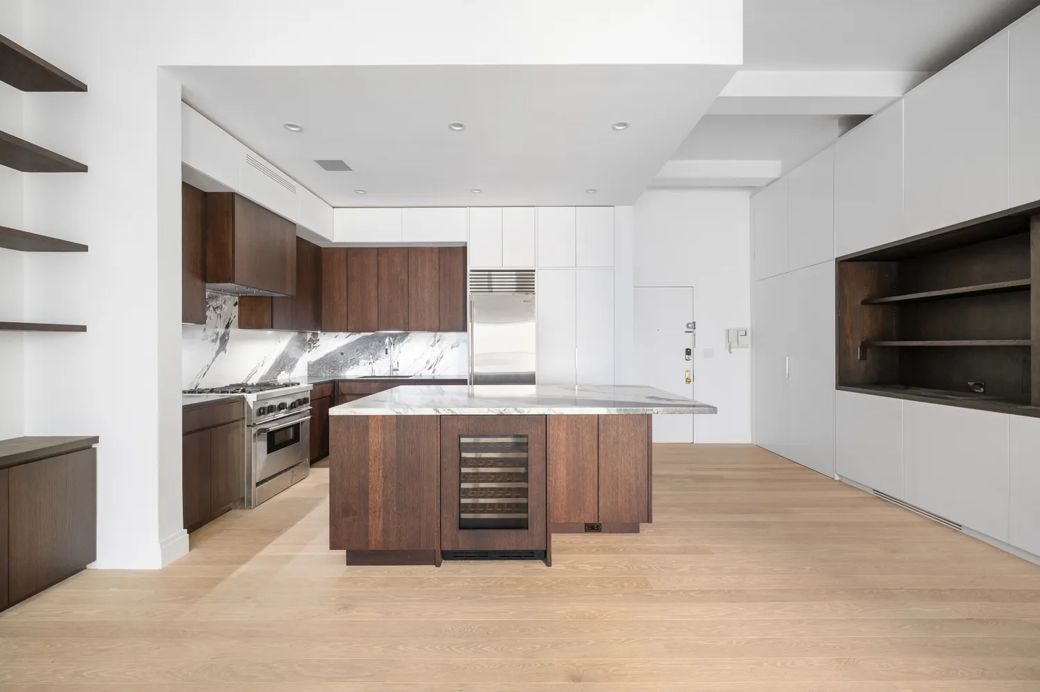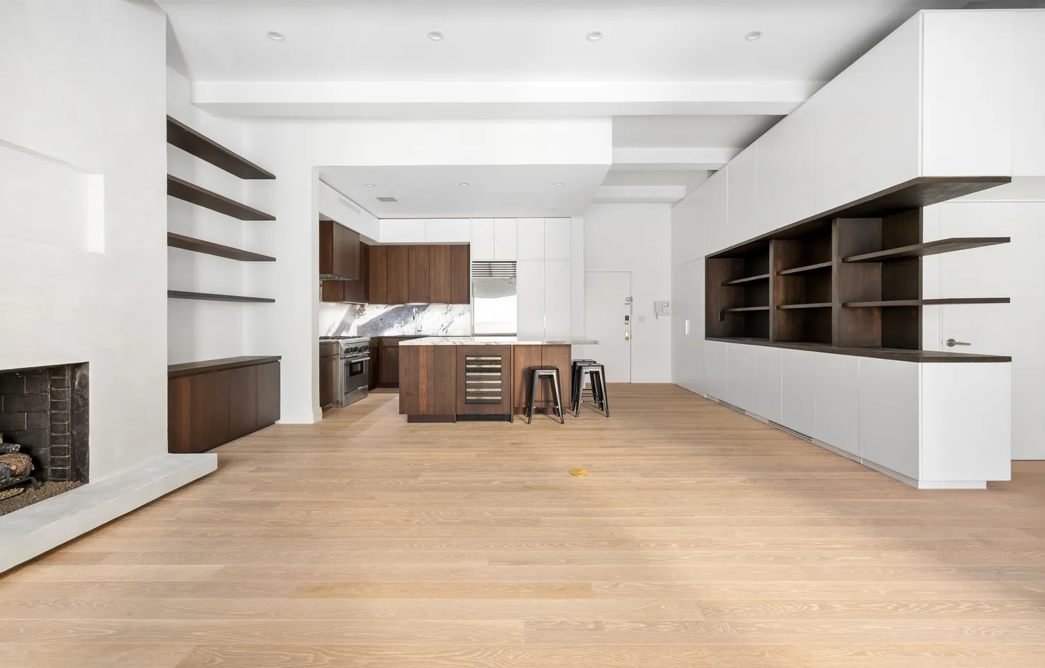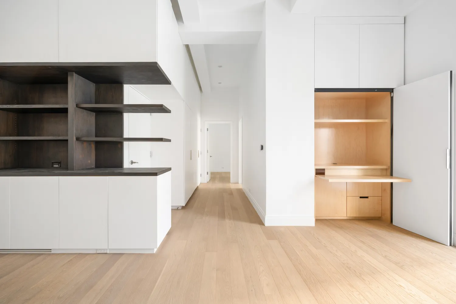 Opposite the kitchen is a full wall of custom built-in storage, including a discreet fold-away home office with an integrated desk and filing drawers—perfect for working from home without sacrificing living space. A large walk-in closet sits in the apartment entrance for additional storage.