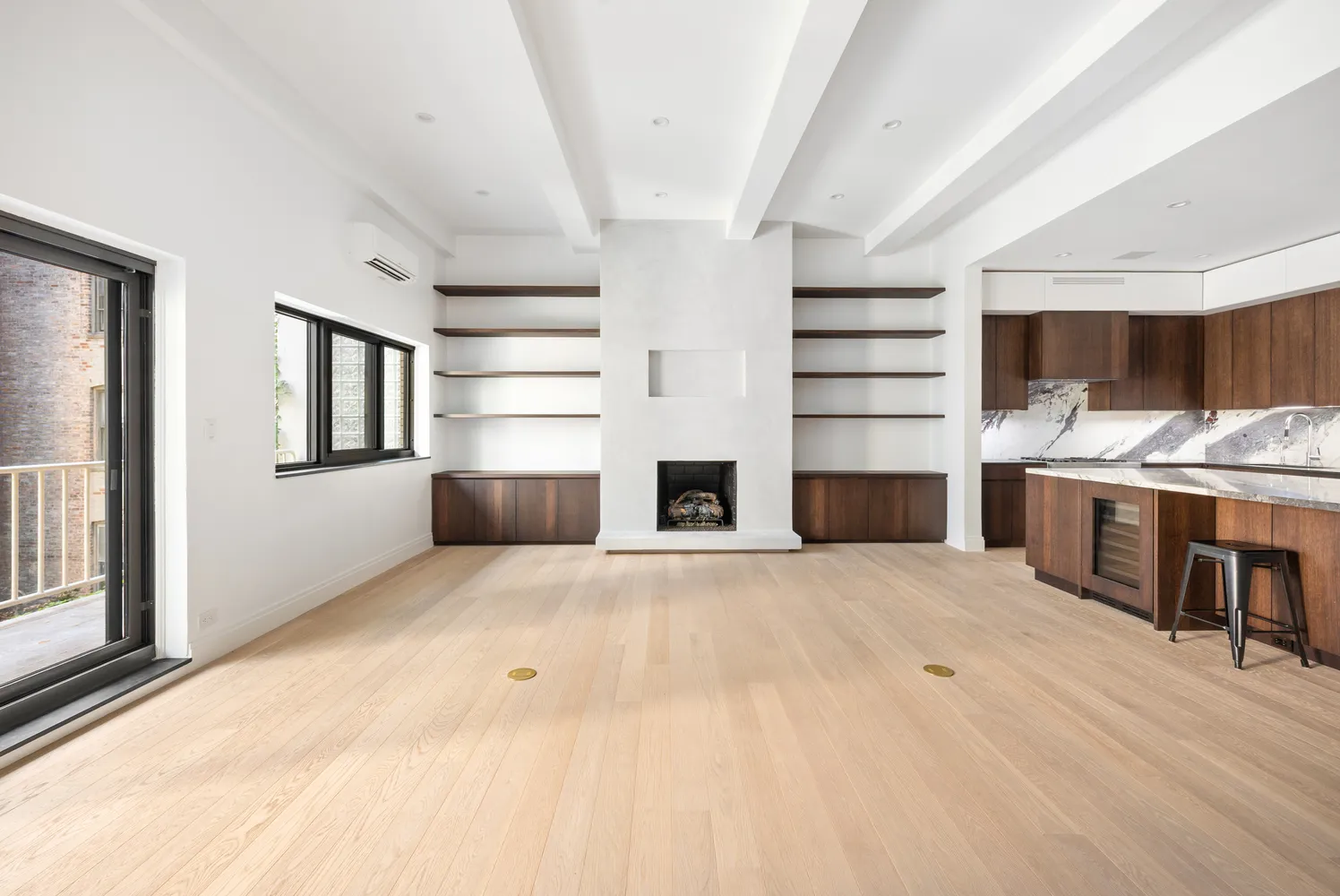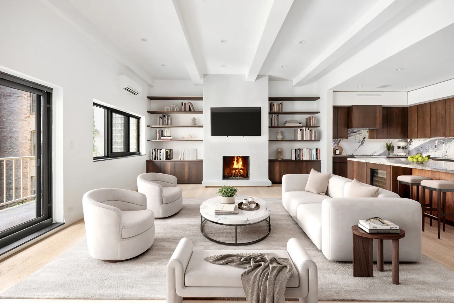 Step into a dramatic great room with 11'2" ceilings, oversized windows, and natural light pouring in throughout the day. A remote-controlled gas fireplace by Real Fyre anchors the living area, with a pre-wired TV mount above. Just off the living room, a private balcony overlooks a quiet stretch of leafy backyards and private gardens—your own West Village escape.