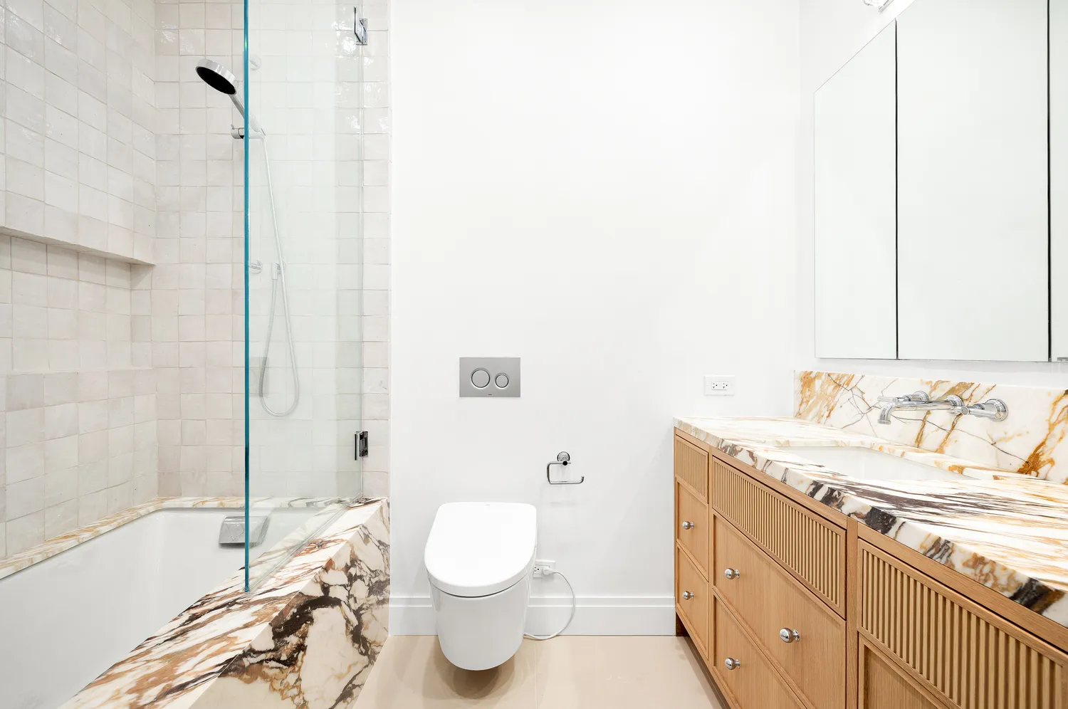 The second bedroom fits a queen-sized bed and offers generous light from oversized windows and an entire wall of built-in closet space. The guest bathroom is finished with Calacatta Vagli Rosato marble, a deep Tea for Two soaking tub by Kohler, Dornbracht and Kallista fixtures, and a Toto bidet toilet. The in-unit laundry room is tucked behind floor-to-ceiling cabinetry and includes Miele washer and dryer units, plus storage and folding space.