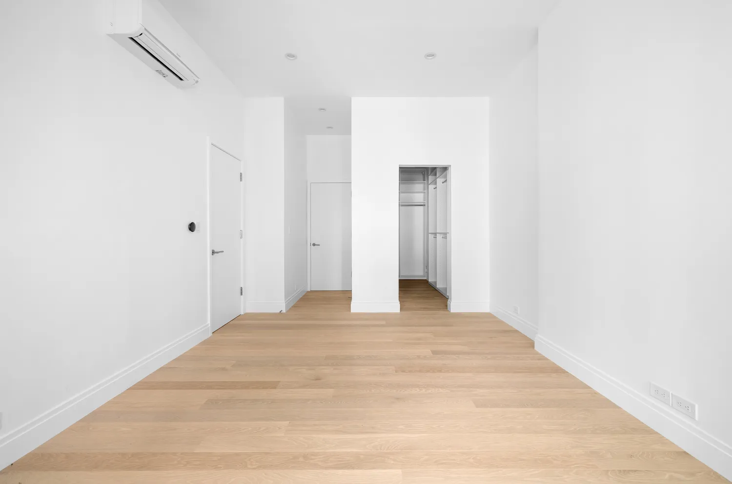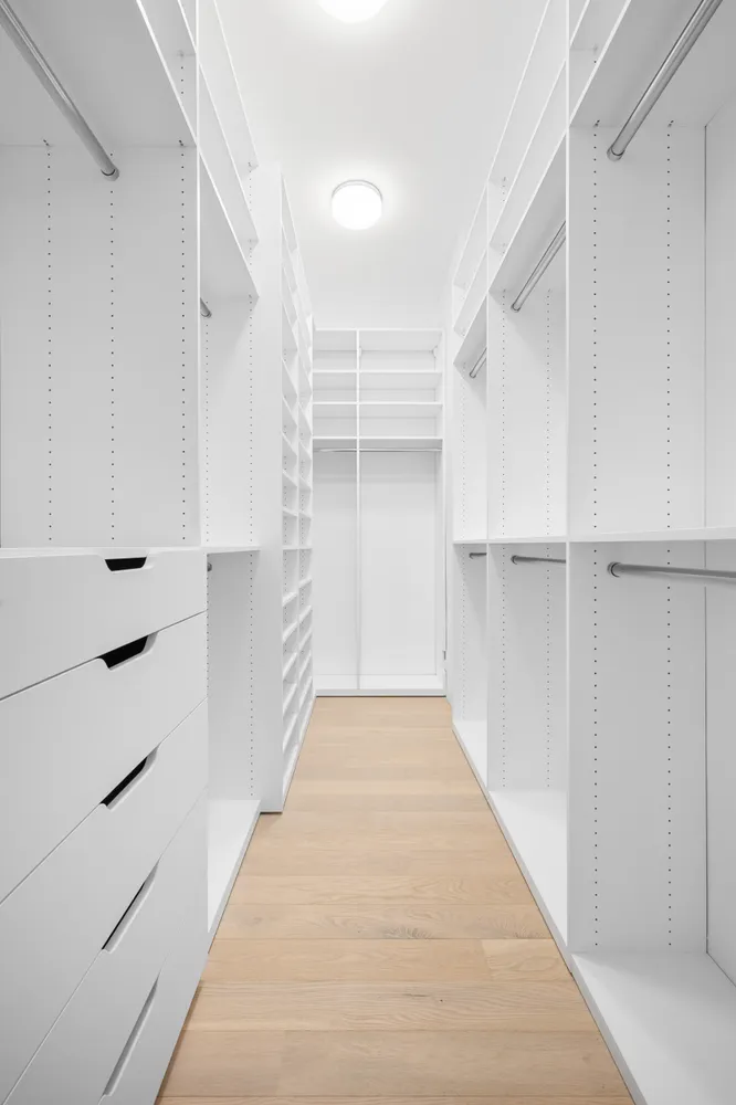 The primary bedroom suite sits quietly at the end of the hallway. Large enough for a king-sized bed with side tables and additional furniture, it also features a custom walk-in closet with built-in shelving, closed off with custom sliding modern wood doors. The en-suite primary bathroom was designed as a home spa, complete with a Dornbracht rain shower, hand shower, Graniti Fiandre stone-effect porcelain tiles, and a top-of-the-line Toto bidet toilet.