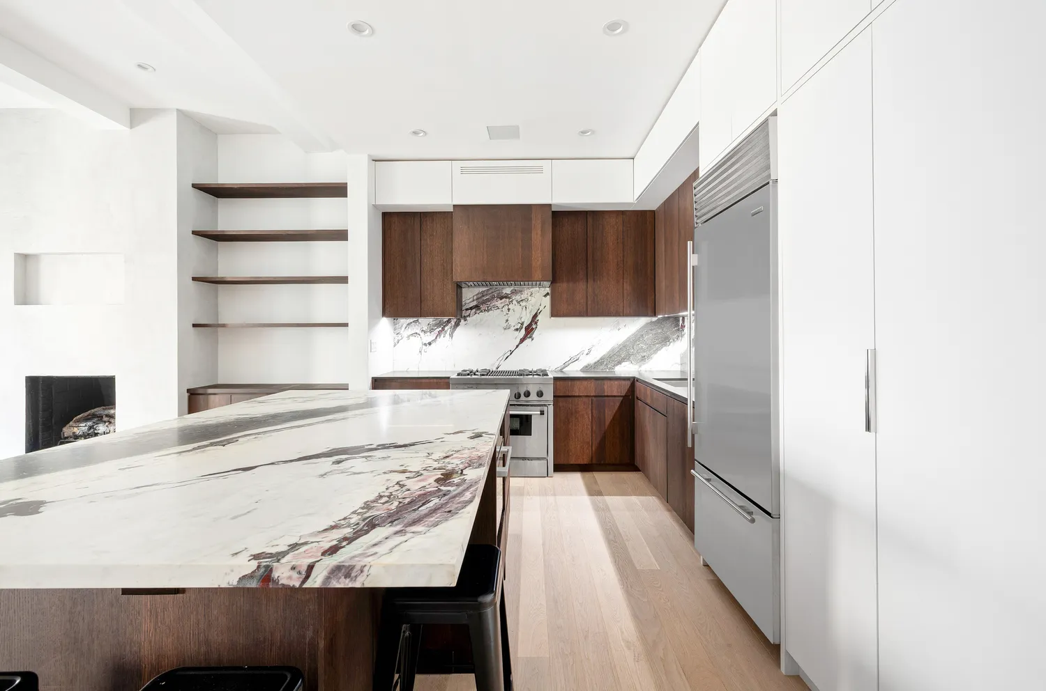 The open chef’s kitchen is both functional and beautiful, featuring a massive Fiore di Pesco marble island protected with ToughSkin. High-end appliances include a vintage Thermador gas range, Sub-Zero refrigerator, Miele speed oven (microwave, air fryer, convection, and oven in one), Miele dishwasher, and Elica wine fridge. The deep sink is paired with a Dornbracht faucet and their built-in filtered water system.