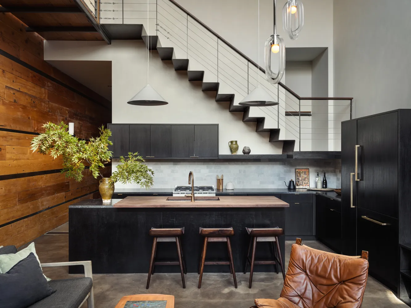 Indoors, the grandeur continues with a 28-foot ceiling in the living/dining area, double-tiered glass windows, a cozy fireplace, and a sleek staircase that leads to a second-floor catwalk connecting to the northern roof deck, paved with concrete pavers. The open kitchen, with its dark stone countertops and premium appliances, seamlessly flows into the living area. The main level also features an office with custom built-ins, a vented washer/dryer, a custom-outfitted coat closet, a powder room, and radiant heated poured concrete floors throughout. Upstairs, the second-story bedroom offers an en-suite bath and glass walls that open to a private south-facing terrace, creating a serene and tranquil oasis.
