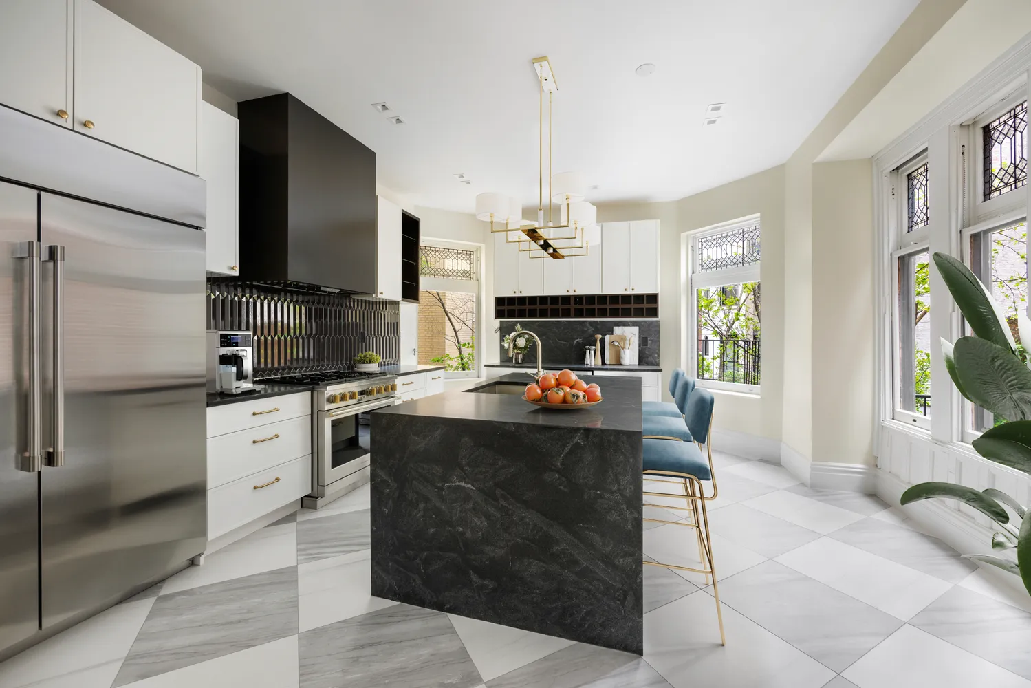 The parlor floor boasts 11-foot ceilings and a vast 50-foot combined living and dining area that opens onto a terrace, offering seamless indoor-outdoor living, perfect for entertaining. The beautiful new gourmet kitchen is a true centerpiece, designed for both function and style. The second floor houses a private full floor primary suite with a new spa-like radiant heated bathroom and walk-in closet, spanning a sprawling 1,500 sq ft. The third and fourth floors offer an additional 4 bedrooms, three full bathrooms, a sun-drenched family room/office with spectacular views, a library and homework nook, as well as a deck. The backyard, featuring a patio with bluestone paving, is perfect for outdoor dining and relaxation.