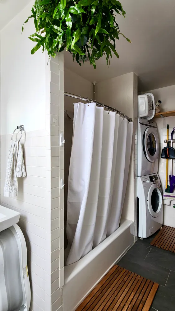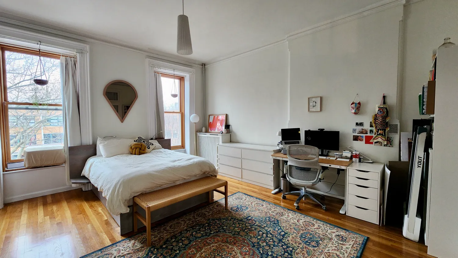 The bathroom is oversized and windowed, with a tucked-away in-unit washer/dryer — a rare and welcome bonus. Throughout, you’ll find thoughtful touches like French doors, custom closets, and excellent ceiling height.