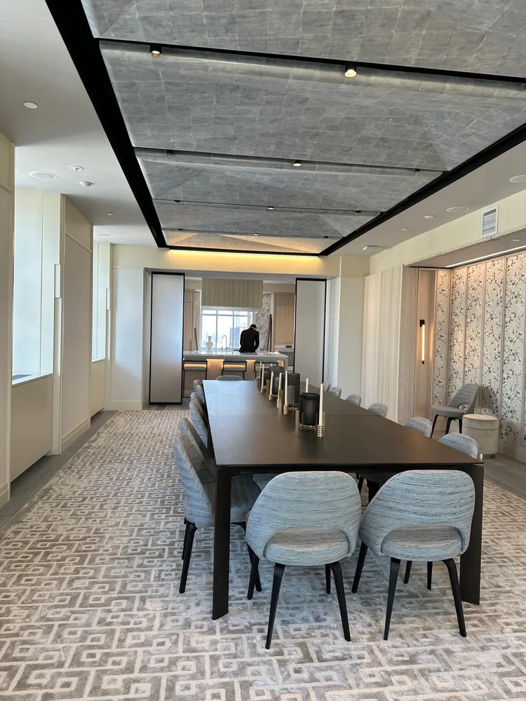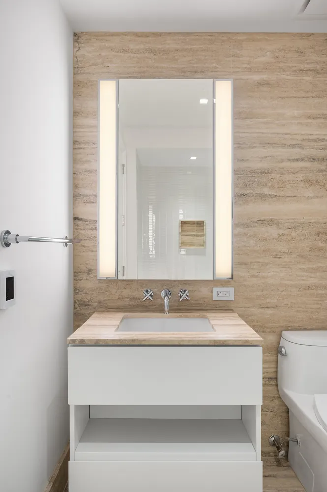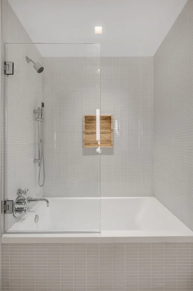The kitchen provides seamless technology coupled with classic elegance. Oceanwood marble slabs rest on custom Aran Cucine cabinetry accented by white glass panels and satin nickel finishes. No expense was spared when outfitting the kitchen: from the best in class Meile appliances to the insinkerator garbage disposal. The bathroom is stunning and spacious with stylish tiles, a large vanity, a mirrored medicine cabinet integrated with LED lighting, radiant floor heating, and a deep soaking tub with rainfall shower head and separate wand. High speed Wifi is included in the rent and coverage is across the entire building.