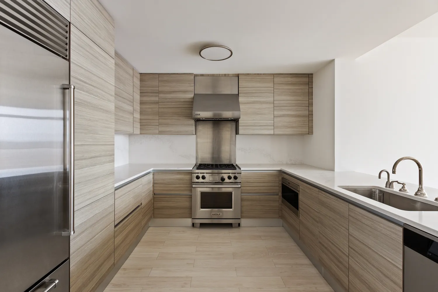 Upon entering, you are greeted by a spacious foyer featuring a convenient hall closet. To the left lies a kitchen that will fulfill any home chef's dreams, boasting Italian custom cabinetry, state-of-the-art appliances including a Sub-Zero integrated refrigerator, a Wolf gas range, a Miele dishwasher, and a Wolf microwave. The kitchen is elegantly finished with Caesarstone countertops and backsplash.