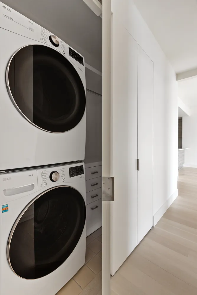The residence provides an abundance of storage, enhanced by a fully equipped laundry room featuring an LG stacked washer and dryer complemented with additional shelving, as well as beautifully crafted custom wood cabinets across the hall.