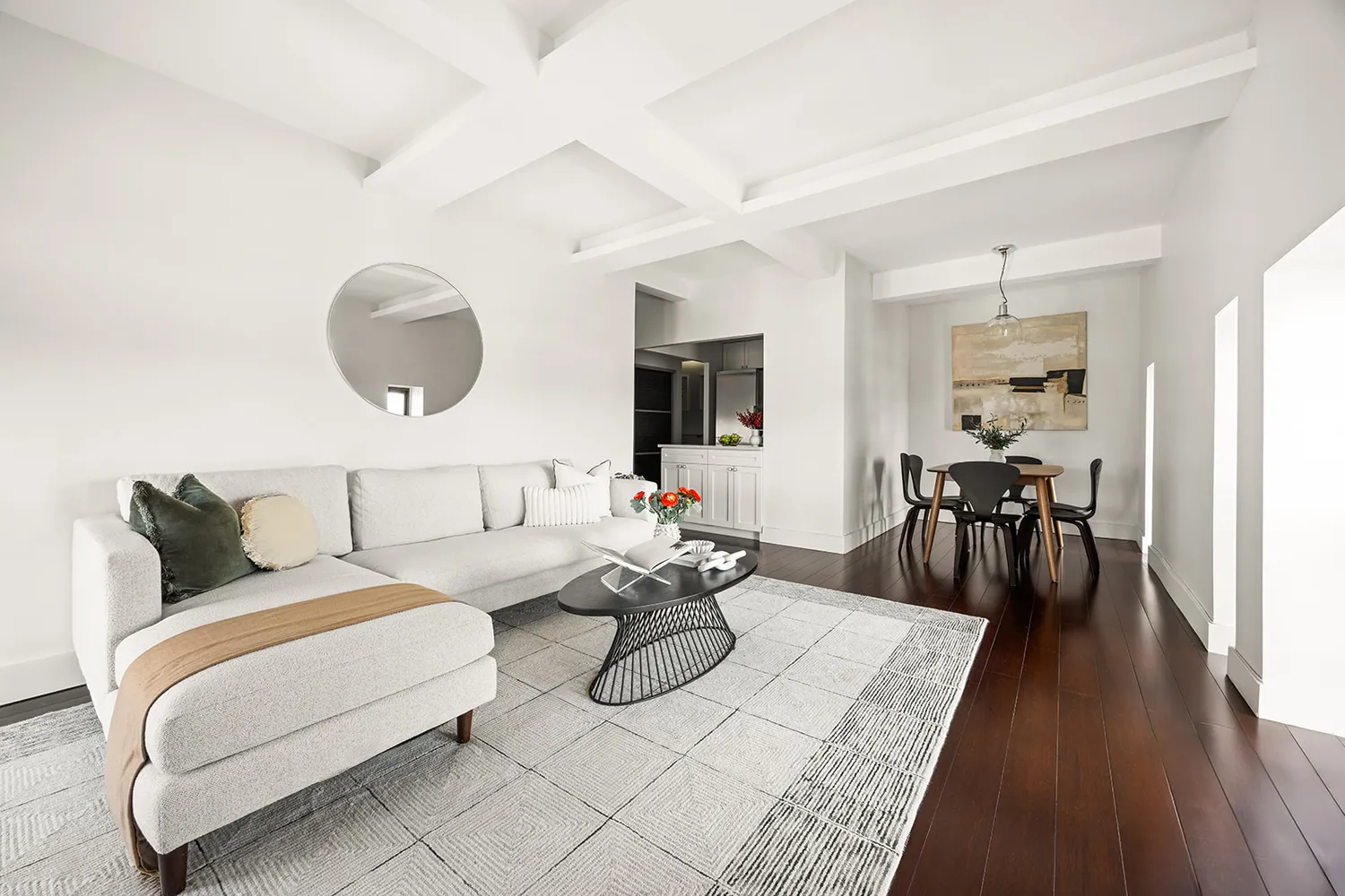 Step inside through a welcoming foyer that opens into a spacious living room and separate dining area, framed by six windows and accented by classic beamed ceilings. This light-filled setting is ideal for both entertaining and quiet relaxation.