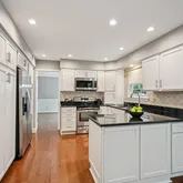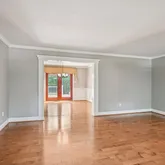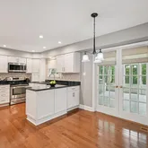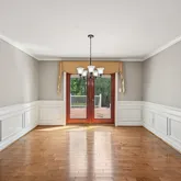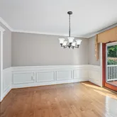 The formal living room features gleaming maple hardwood flooring, crown molding, and abundant natural light from double windows. Perfect for entertaining, the living and dining rooms flow seamlessly, allowing for an expanded holiday table. The dining room showcases exquisite wainscoting, custom millwork, and a newer sliding door that opens to the deck, blending indoor and outdoor entertaining. A French door provides convenient access to the kitchen.The kitchen is a chef’s delight, boasting crisp white shaker-style, soft-close cabinetry, sparkling granite countertops, and a complementary ceramic tile backsplash. Stainless steel appliances—including a glass-top range, microwave, dishwasher, and refrigerator—complete this stylish and functional space. The adjacent breakfast area easily accommodates a family-sized table.