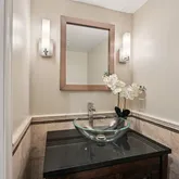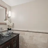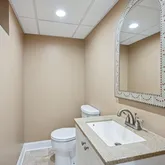 One of the standout features of this home is the expansive four-season sunroom. With wide plank luxury vinyl flooring, vaulted ceilings, and sweeping views of the private backyard, it’s the perfect spot to relax year-round. The heart of the home is the open-concept kitchen-to-family room layout. The spacious family room is anchored by a stunning marble gas fireplace framed by custom built-in bookcases. Recessed lighting and French doors brighten the space, while neutral 24x24 ceramic tile flooring ties the room together. The updated powder room has a modern glass bowl sink set in cabinet base with gorgeous ceramic tile.