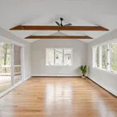 - Interior Features: Cathedral Ceiling(s), Ceiling Fan(s), Beamed Ceilings, Open Floorplan, Recessed Lighting, Slider, Bathroom - Half, Sun Room, Den