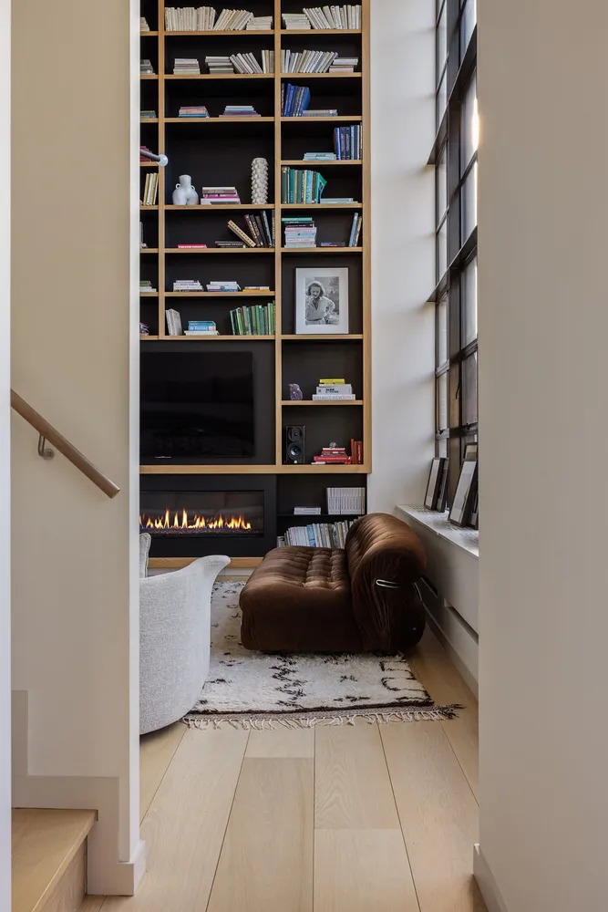 A masterful blend of beauty and functionality, the home features three bedrooms and three-and-a-half bathrooms, anchored by a breathtaking main living space with soaring 20-foot ceilings. Design highlights include 10-inch-wide white oak flooring, a striking 20-foot custom bookcase, and a natural gas fireplace framed by sleek steel casement detailing. Abundant natural light floods the space, creating a serene yet architecturally compelling atmosphere.