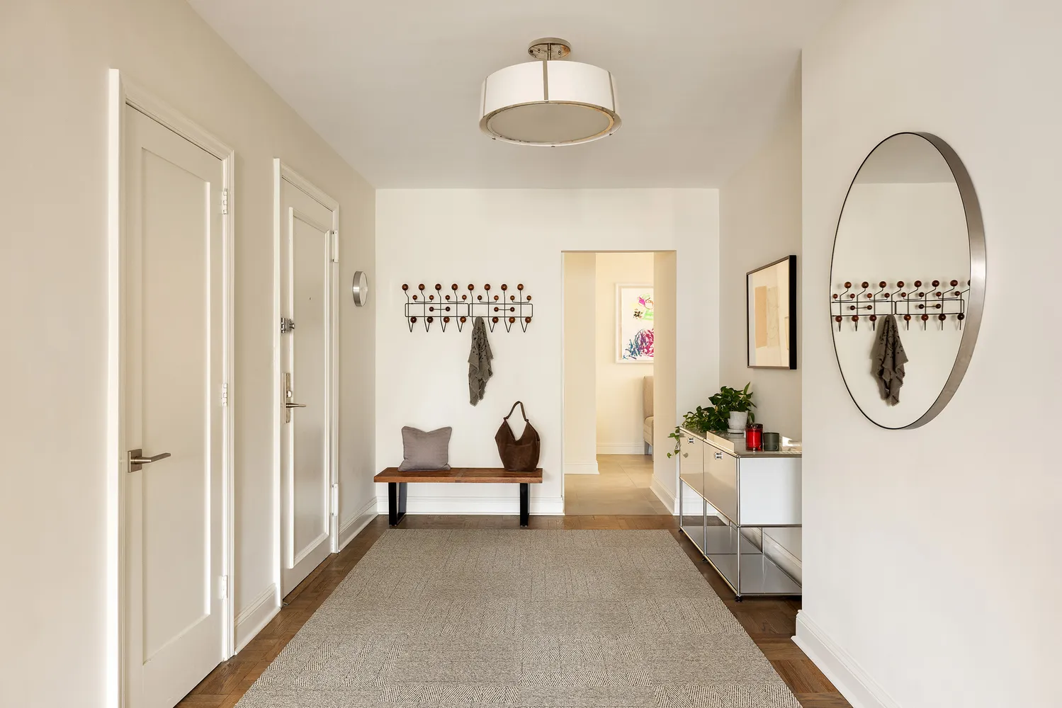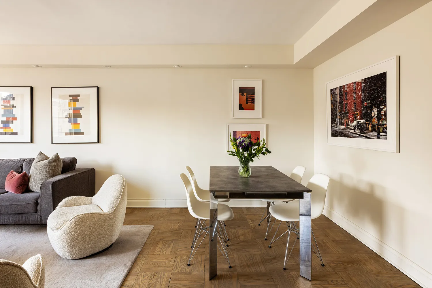 A gracious foyer opens into a double-wide living room with southern and western exposures, open city views, and breathtaking sunset light. This large, airy great room offers plenty of space for dining and entertaining.
