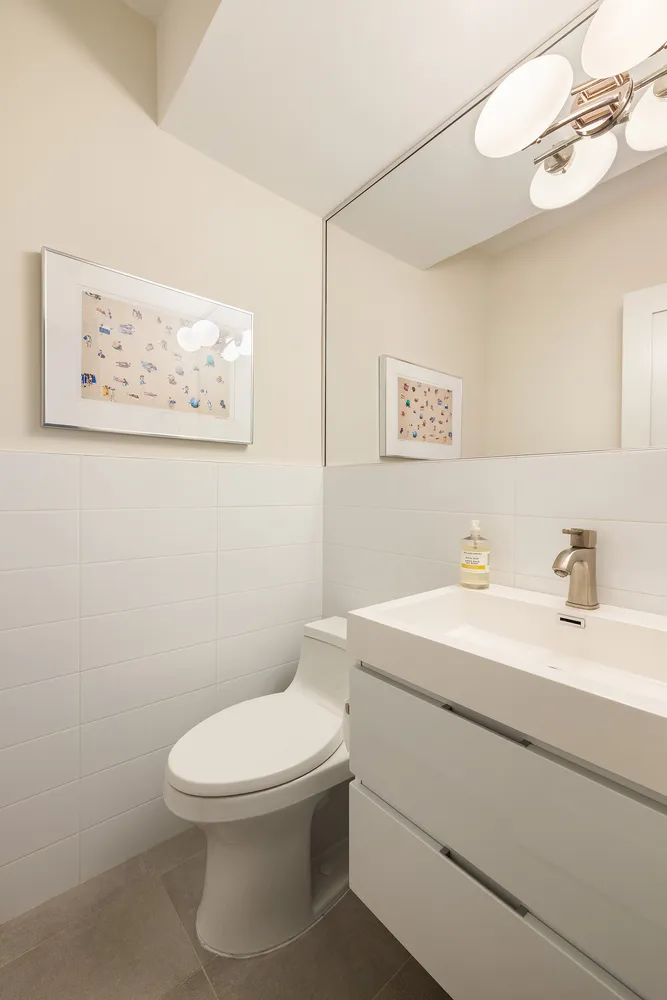 The bedroom wing consists of a large primary suite and a second bedroom and den on the other side. The luxurious primary has two exposures, a mint condition en suite spa-like bathroom and two large walk in closets. A spacious second bedroom is complemented by a versatile den, perfectly suited for use as a guest suite, nursery, media room, or stylish home office. Each renovated bathroom is finished in a soft palette with hand laid porcelain tiles, and Grohe fixtures.