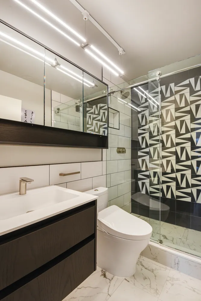 The heart of the home is the stunning open chef’s kitchen, which features smart appliances and contemporary finishes, including a Bertazzoni dishwasher, Silestone Calaccatta Gold - Polished countertops and a convection oven. A large, sleek breakfast bar provides a seamless transition into the spacious living room, creating an open-concept layout perfect for both daily living and stylish entertaining. The large bedroom has tasteful built-in custom shelving and a desk. The stylish bathroom is finished with Walker Zanger tile and a Lacava vanity and mirrored medicine cabinet.
