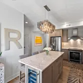 As you approach, you're welcomed by a newly crafted stone patio, perfect for savoring your morning coffee. Step inside to discover a stunning designer kitchen, complete with a counter-to-ceiling marble backsplash, marble countertops, an oversized island for gathering, and show stopping chandelier lighting. The kitchen's custom cabinetry includes slide-out shelving and a built-in cubby to discreetly store countertop appliances. Premium stainless-steel appliances and a wine fridge tucked into the kitchen island enhance the space's functionality and style.