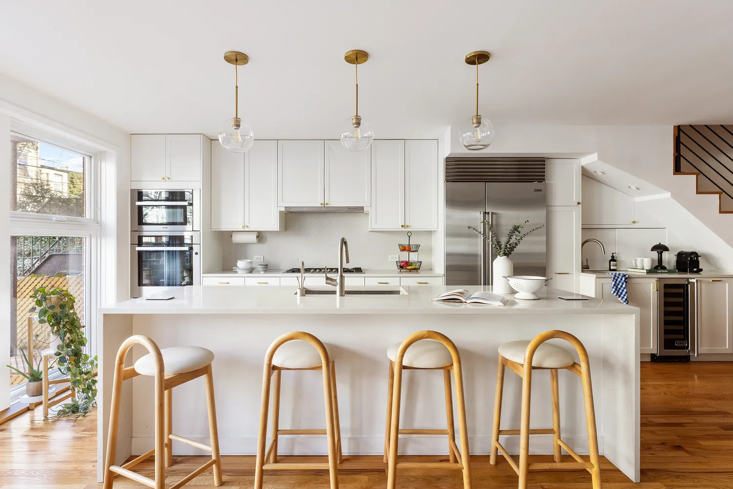 The home’s entry features a spacious foyer with custom closets and seamless access to an open-concept kitchen, dining, and living area that is flooded with natural light from a wall of floor-to-ceiling windows. The chef’s kitchen is equipped with a wide Sub-Zero refrigerator, Bosch dishwasher, Miele oven, and double Gaggenau stove. Elegant white custom cabinetry with brass hardware is paired with sophisticated quartz countertops and backsplash.