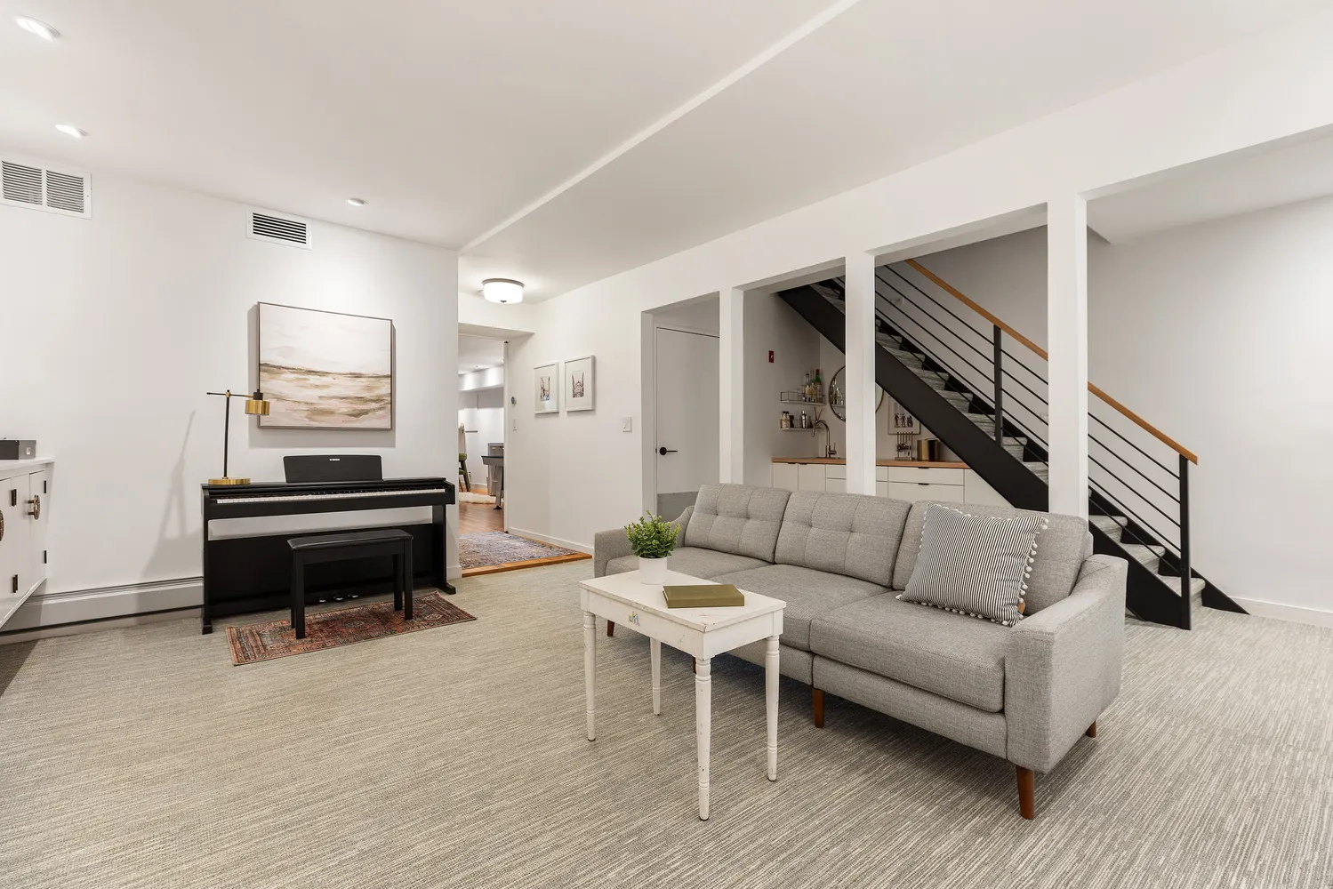 The garden level offers a versatile space with a custom-designed playroom/den, wet bar, full bathroom, and spacious family room with a custom entertainment center and direct access to the tranquil garden. The low-maintenance garden features a cherry blossom tree, Japanese maple, and blue stone framing, perfect for entertaining or relaxing outdoors.