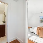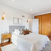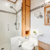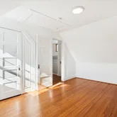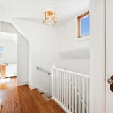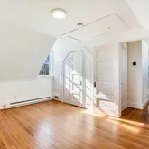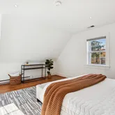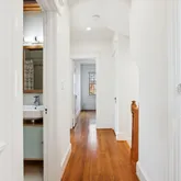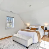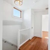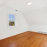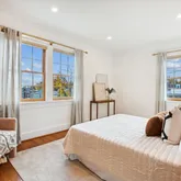 The second level offers three convenient and spacious bedrooms along with two renovated bathrooms. The hall bathroom offers a unique and restored ventilation hatch and skylight that draws light and appreciation for the period details of the home carefully integrated into the spaces. The large primary suite offers ample closet space, a walk in shower with frameless glass, floating vanity and linen storage. In addition, a trained eye will detect the designer wall sconces and window treatments that adorn the space.