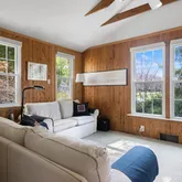 As you step inside, you'll be greeted by beautiful hardwood floors throughout most of the home. The cozy living room welcomes you, accompanied by an office to the left that features a full bath and could easily be utilized as a fourth bedroom. On the opposite side, you'll find an ample-sized dining room with a bay window, followed by a den with a wood stove that opens to a galley kitchen. Step outside to the covered back patio, perfect for enjoying the outdoors.