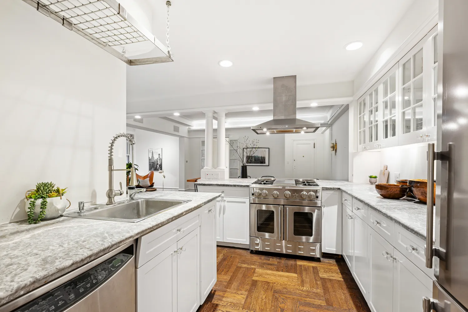 Enter the private foyer directly from the elevator (the first floor is above the lobby level) and be welcomed to two separate wings of this magnificent home. To the north, you arrive into a grand open concept space with prewar charm. The living/dining area flows to the open gourmet kitchen. The kitchen has a separate breakfast area and opens onto the terrace. Beyond the kitchen, is the butler’s pantry with plenty of storage and a washer/dryer. Taken in its entirety, the space is perfect for two or twenty.
