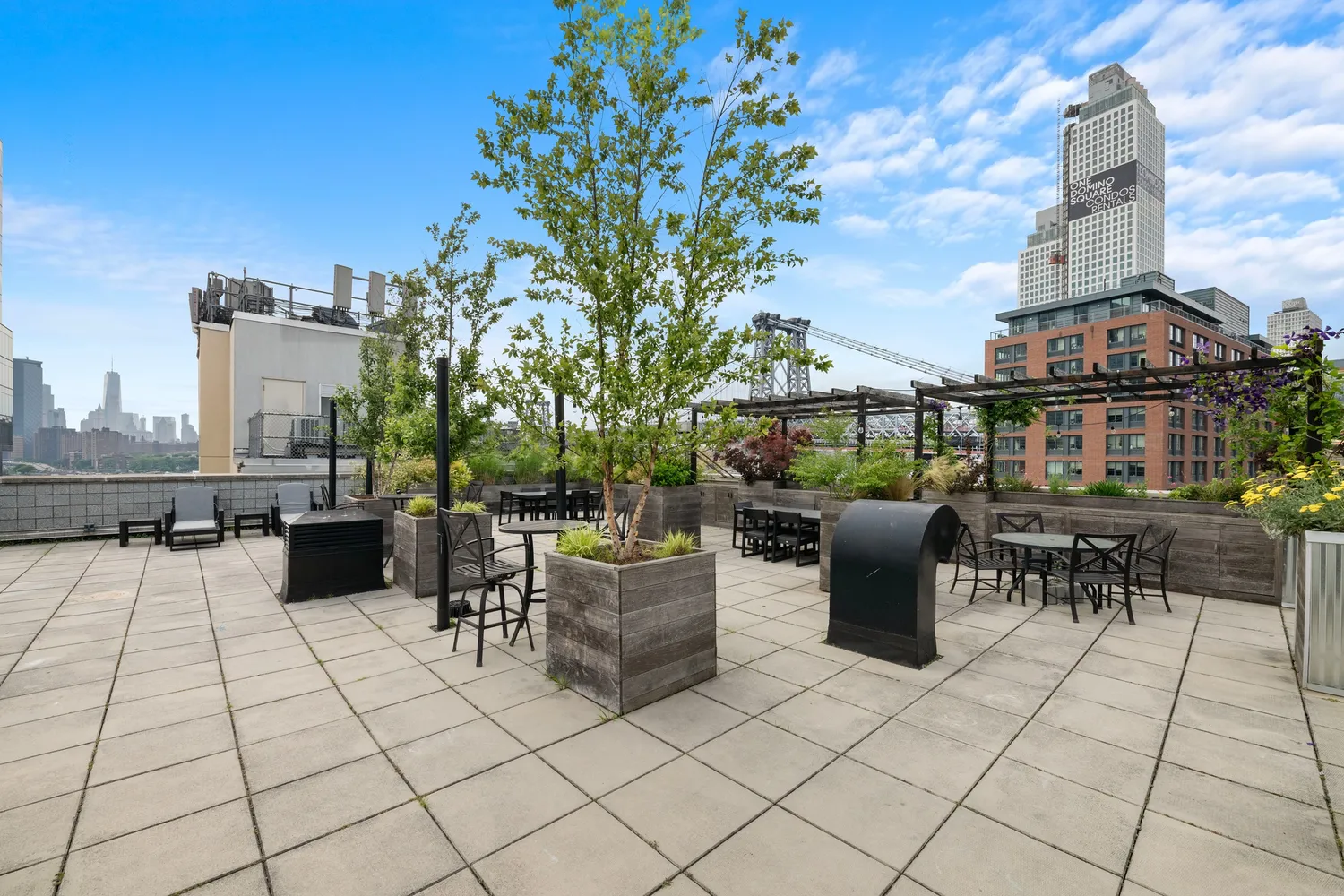 Residents have access to a range of amenities including a bike room, fully equipped gym, wine cellar, and a recently refinished roof deck boasting breathtaking views of Manhattan and Dumbo, complete with a Viking grill for outdoor entertaining.