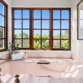 closets cleverly positioned to muffle street noise. The bright bathroom has dual vanity basins,