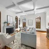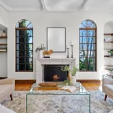 stately living room, graced by fireplace and garden scenery.