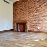 * Spacious Living / Dining Room (17ft'/ 15ft'7") With an Exposed Brick Wall, Soaring High Ceilings Original and Perfectly Restored Beams and Decorative Fire-Place