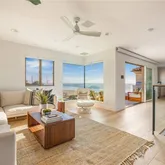 Primary Suite: Designer lighting, custom built-ins, motorized blackout and soundproofing drapes, and French doors to a private patio with ocean views. The spa-like bathroom includes a soaking tub, walk-in shower, dual vanities, custom walk-in closet, underfloor heating, and a Toto Neorest toilet with advanced functionality.