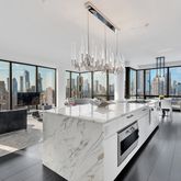 The open chef's kitchen is replete with Calacatta marble countertops, integrated Gaggenau appliances, and a Dacor convection oven.