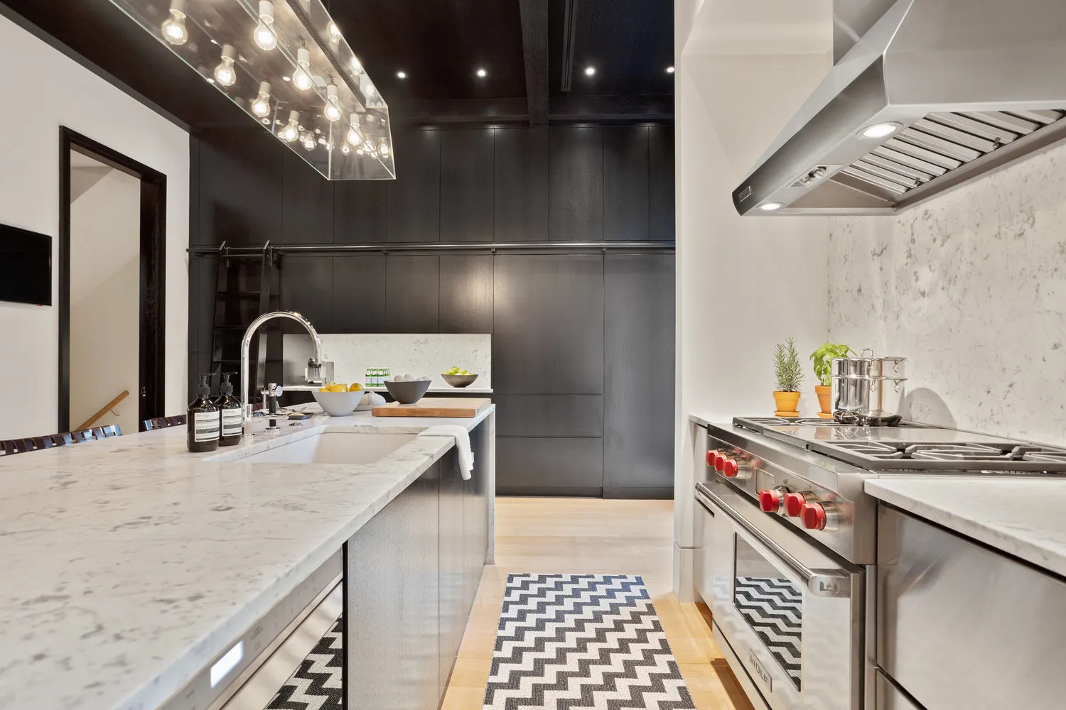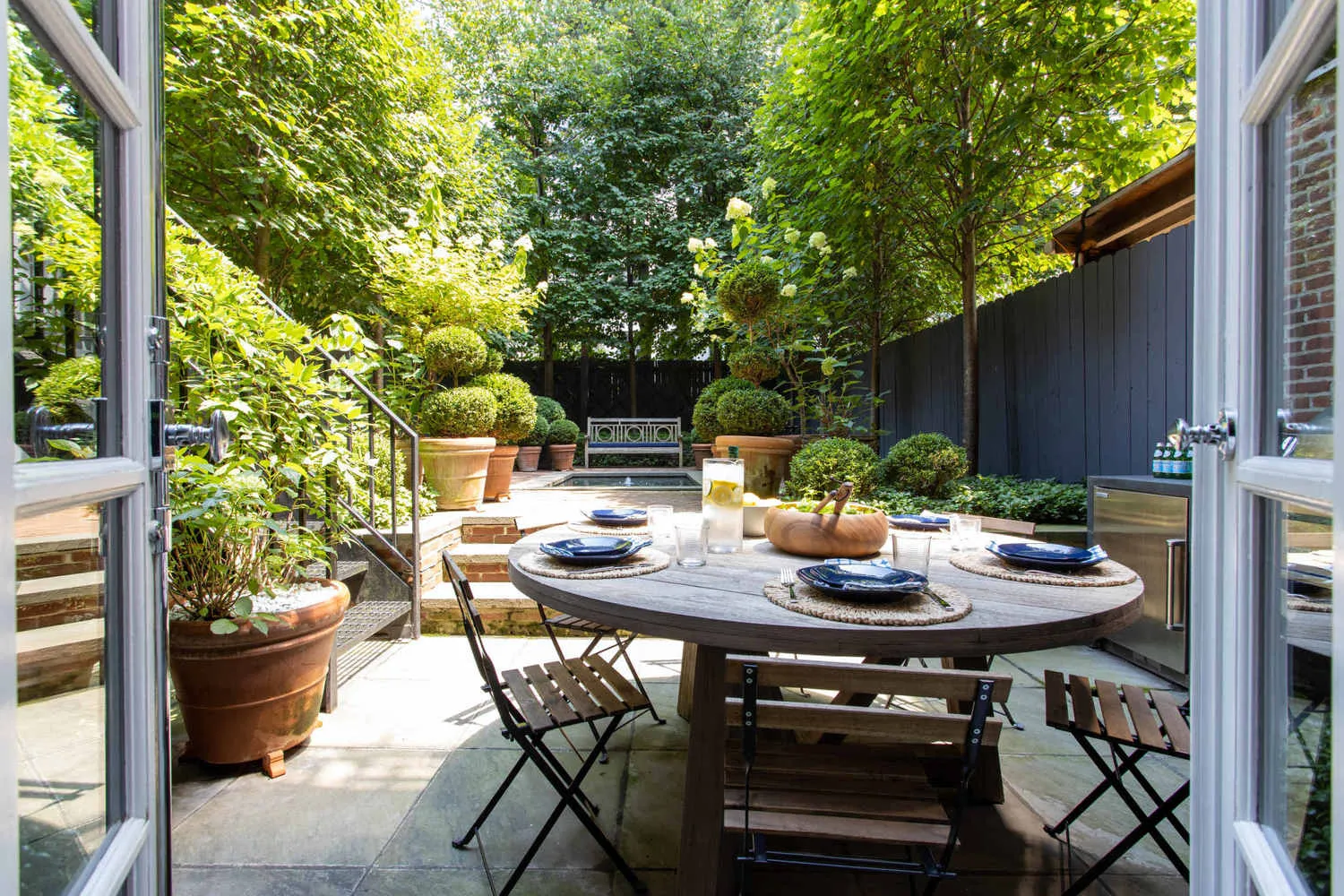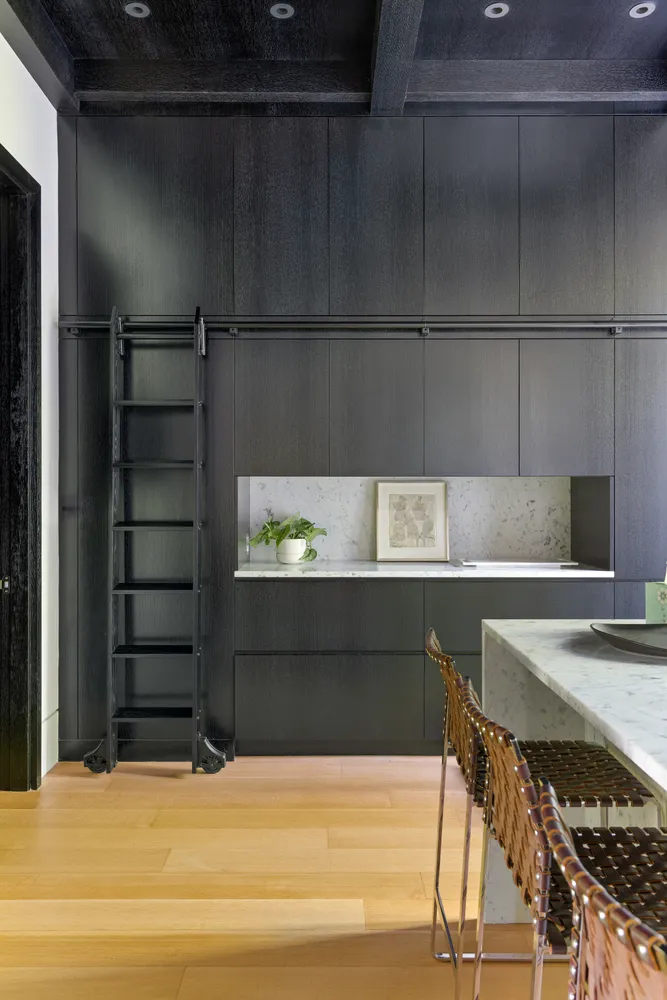 The kitchen is fully outfitted with high-end appliances, including a Wolf range with grill, Wolf microwave drawer, Miele dishwasher, and Liebherr refrigerator/freezer. Floor-to-ceiling oak cabinetry includes a rolling library ladder, and the oversized Carrara marble island doubles as prep space and breakfast bar. A powder room is tucked just off the kitchen, and custom French doors open to a beautifully landscaped 1,056-square-foot garden. There is an irrigation system in both front and back gardens, and the outdoor kitchen includes a Wolf grill, Sub-Zero refrigerator, sink, and cast concrete countertop.