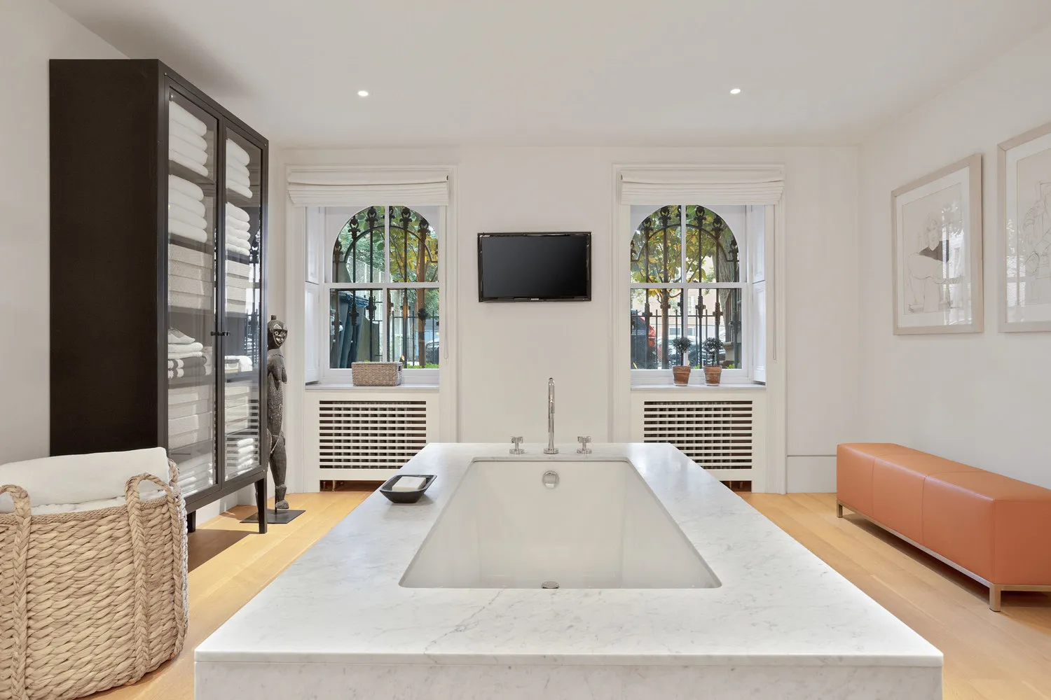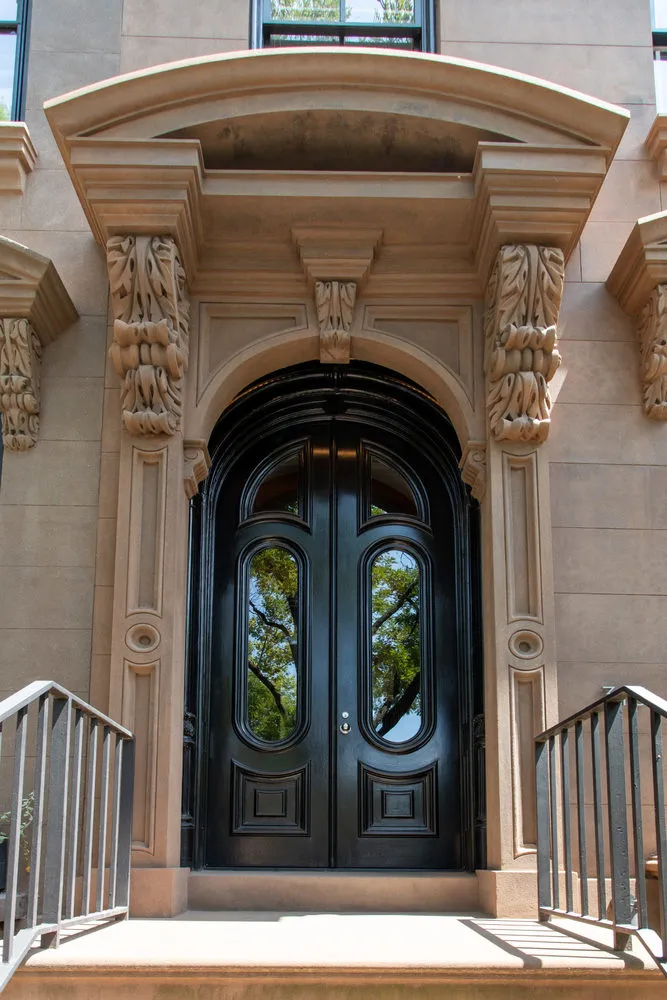 Downstairs, the garden level includes a spacious primary bedroom with a full wall of custom lacquered closets, a hallway lined with additional storage (including a hidden home office), and a spa-like bathroom with a soaking tub, walk-in shower, and double marble pedestal sinks. A second original fireplace adds charm. Additional features in the duplex include central air, original radiators with custom covers, custom-stained oak doors with Nanz hardware, Yamaha in-ceiling speakers, O’Lampia lighting, Forbes & Lomax switches, and a full LG washer and dryer in the laundry room.